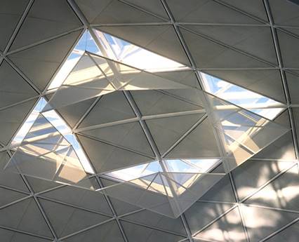 斯坦斯特機場的屋頂設計是整個建築的亮點之一。福斯特為屋頂設計了一系列金屬網格狀的模組化單元,每個單元均內嵌通風與照明設施。這些單元不僅能夠有效地引導自然光進入,還內建遮陽裝置以控制陽光直射的熱量。此外,屋頂的結構設計使得暖通空調系統得以隱藏於地板下方,讓建築的視覺效果更加簡潔與清爽。