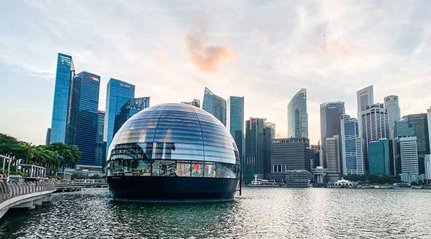 新加坡濱海金沙蘋果店(Apple Marina Bay Sands)位於濱海灣金沙(Marina Bay Sands)水域之上,是蘋果公司全球首家水上旗艦店,由英國建築師諾曼•福斯特(Norman Foster)及其建築事務所Foster + Partners設計,於2020年正式開放。這座建築融合了創新的建築技術、環境永續設計與品牌理念,成為新加坡城市景觀中的一顆璀璨明珠。濱海金沙蘋果店不僅是一座零售空間,更是一個集自然、科技與文化為一體的多功能場所。