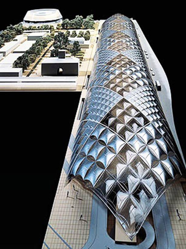 幕簾系統由1200多根手工製作的銅管組成,每根銅管以精密的技術安裝在機械控制的支架上。這些銅管在陽光下呈現出溫暖的金色光澤,隨著幕簾的開合,建築的形態與光影效果發生變化,為訪客提供了一種具有戲劇性與動態美感的視覺體驗。這一設計不僅是一種藝術表達,也是一項技術創新,充分體現了福斯特與赫爾佐格和德梅隆對傳統文化現代化轉譯的深刻理解。