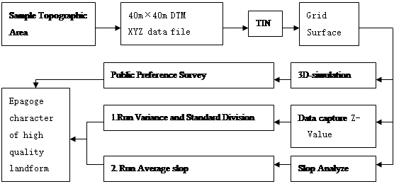 技術方法: DTM(Digital Terrain Model)是近年來地理資訊系統發展的重要工具,透過衛星遙測或地面測量插入法推算,可於電腦中類比矩陣網格的地表模型,並可透過該地表模型之海量高程資料做成坡度分析、坡向分析、高程分析、視域分析等圖形。本研究過程之首先將歸納過去前人研究之景觀評價理論:以景觀美學的專家經驗,何者爲高品質之地貌景觀。影響地貌景觀之關鍵因素與關連因素。然後選取遊客偏愛之多個風景區做爲研究案例,運用DTM(Digital Terrain Model)技術製作地形地貌模型並分析其各種資料的數學統計特徵,並以地形地貌模型圖片(排除色彩、質感、植被等因數)進行遊客偏好調查,與DTM數學統計結果進行比較,歸納做爲結論。