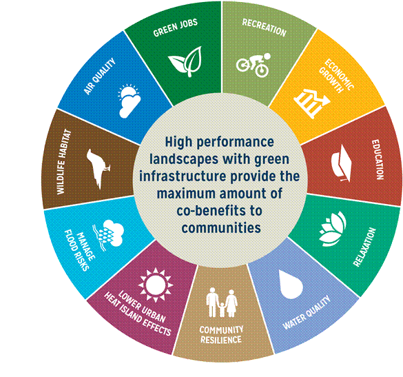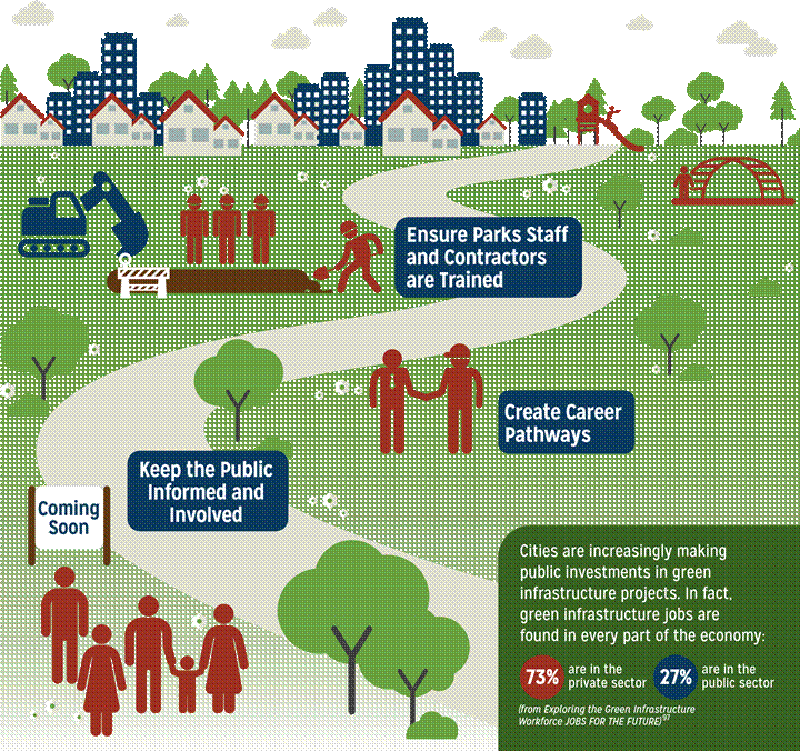 公園為綠色基礎設施提供了理想的機會,因為它們通常已經是高度可見的多功能公共空間,通常包括綠色元素。在過去十年中,隨著人們對綠色基礎設施好處的瞭解不斷增加,綠色基礎設施的使用也在增加。將綠色基礎設施納入公園可以為社區帶來廣泛的改善。將基於綠色基礎設施的公園開發和再開發工作重點放在服務不足、需求往往最大的地區,將確保產生的影響具有社會公平效益以及環境和經濟價值。