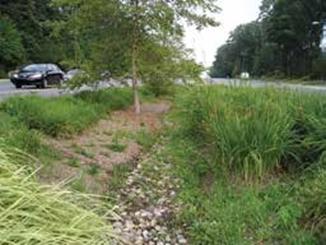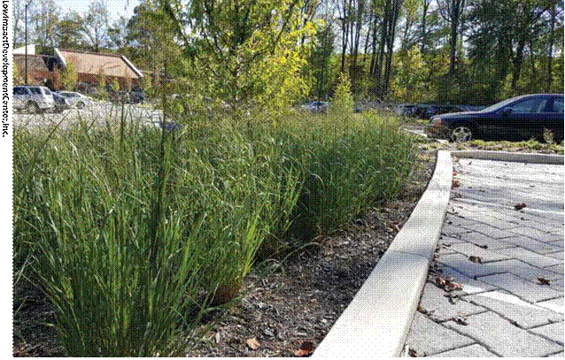 停車場–停車場通過將綠色雨水基礎設施整合到其設計中,為減少雨水逕流提供了許多機會。用透水性鋪路材料代替傳統瀝青可以促進雨水逕流的滲透。BioSweels或BioTention cells可捕捉或減緩逕流,並可安裝在現有或擴建的中央分隔帶或停車場邊緣。在停車場周圍和停車場內種植樹木和原生植被,有助於減緩逕流,同時減少熱島效應,使公園環境更適合行人。