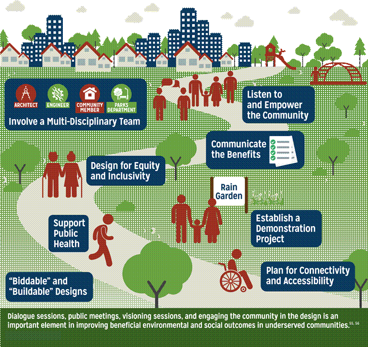 將綠色雨水基礎設施與公園改造和新公園開發相結合,以增加社會公平,有助於確保開放空間通過提供多種環境和社會效益,並幫助城市更公平地發展或振興,充分發揮其潛力。通過在現有公園和新公園中添加綠色基礎設施元素來創造新的高性能公共空間並非沒有社會和經濟影響。在某些情況下,這樣的基礎設施可以促進環境的貴族化。從最初的概念設計開始,到規劃階段,必須注意這些投資不會導致對現有社區產生負面影響的貴族化。