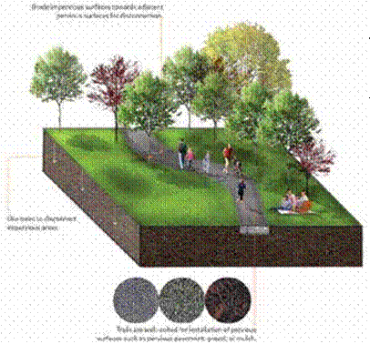 環境敏感設計-現有公園或規劃用於公園重建的土地的大小和形狀可能會影響可用於雨水管理的土地數量。確定任何應避免的區域是評估現場綠色雨水基礎設施能力的重要步驟。在空間有限的情況下,允許水滲入土壤是一個挑戰。將綠色雨水基礎設施實踐與現有景觀特徵相結合,例如在中央分隔帶或停車場旁邊放置生物滯留區或生物牆,可實現多種用途。