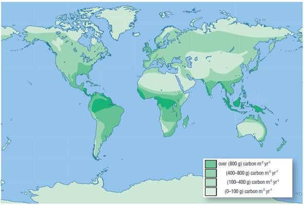 溫度對所有化學反應都很重要,植物內部發生的反應也不例外。冬季溫度低,降低了植物的活動速度,因此植物的生產力趨於下降。較低的溫度也會使植物難以吸水。這意味著溫帶地區的植物在冬季可能會變得乾旱,這就是為什麼許多樹木在秋天掉落葉的原因。在世界某些熱帶地區,水的可用性也是植物生長的問題。隨著從赤道到摩ri座和巨蟹星座的熱帶地區的距離增加,一年中水短缺的時間更長。如果植物缺水,它會通過關閉葉子上的毛孔來做出反應。但是這些孔是利用大氣中的二氧化碳吸收氣體並利用太陽光產生的能量將其轉化為更複雜的分子(如糖)的手段。因此,當植物缺水並關閉毛孔時,它也減少了光合作用的發生量。換句話說,它降低了生產率。如圖所示,非洲的生產力在赤道和撒哈拉沙漠所在大陸的北部之間逐漸下降,這與水資源的減少有關。