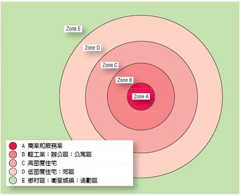 就像一般的景觀圖案一樣,城市的佈局也一樣。在一定程度上,這可以用城市隨時間增長的事實來解釋。最初的住所可能由不多於幾棟房屋組成,但鄉村和城鎮卻擴展成城市。隨著它們的擴展,它們的性質也發生變化,並且在不同地區進行的活動種類也會發生變化。沒有兩個城市的模式完全相同,但是通常一個城市可以檢測到許多城市中都可以找到的市中心區域。在現代化城市的正中間,我們找到了主要的商業和商業區(A區)。通常,這是由摩天大樓部分組成的,該部分已完全取代了城市基礎上的原始住所。相對而言,實際上很少有人會居住在該中心區,因此主要建築物是辦公大樓,百貨商店或購物中心以及娛樂場所,包括劇院,音樂廳,博物館和美術館。在這個中央區域可能還會有大型的公園和花園。中央開發區周圍通常是一個輕工業區(B區),分散的辦公樓和公寓樓容納了許多來自市中心的工人。該區域的建築物通常比市中心的建築物老。儘管可能有足夠的資金用於中心的頻繁改建,但除非市中心需要向外擴展,否則在更換該次區域的建築物方面通常投資較少。下一個區域(C區)通常由安置低薪工人的高密度住宅組成。新來的移民工人通常定居在這個地區,那裡的住房相對便宜,前往工作地點的交通也很簡單。除此之外,還有一個低密度房屋區(D區),高薪工人居住在該區。這是城市的主要郊區住宅區,通常道路交通便利,鐵路網使居民容易進入城市中心,他們通常每天通勤來賺錢。該區域的房屋通常更大,有更大的花園和更廣泛的娛樂設施,例如游泳池,網球場,開放式公園等。