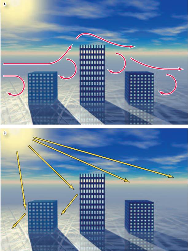 城市微氣候除了空氣流動外還涉及其他因素。陽光本身被建築物的表面吸收並反射。在物理學中,從表面反射的光量稱為反照率。白色表面的反照率高,而黑色表面的反照率低。因此,建築材料的顏色會影響城市街道的吸熱和反射。通常,淺色材料會反射光,因此趨向於變涼。這就是為什麼低緯度城市經常有白牆建築。但是,如果街道很寬,可能會反射太陽光到地面,導致街道上熱量積聚。狹窄的街道和白色的牆壁是解決此問題的簡單方法,並且根據此計劃開發了熱區老城區(例如西班牙的塞維利亞)中建築物的特徵佈置。狹窄的街道同樣允許較少的陽光直接穿透到地面,同樣會產生冷卻影響。狹窄的街道也會影響地面上潮濕,黑暗,靜止的空氣,從而保持較高的水分含量。甚至降雨的模式也會受到建築物的影響,更多的降雨會影響建築物的迎風面,並從建築物的牆壁流到地面。因此,城市的裸露部分比建築物後部的受保護地點受到更多的降雨。