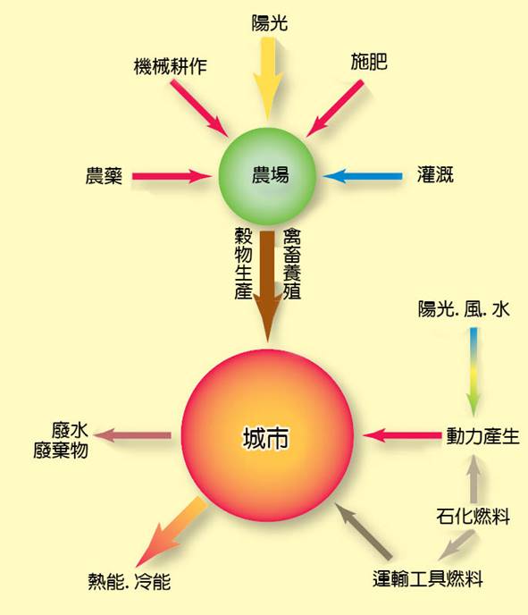 圖3-3 通過農場和城市的能源流動。輸入農場和城市的總能源不僅包括陽光,還包括化石燃料和其他能源產生的能源。農場產生的大部分食物能源都傳遞到城市,最終以熱量的形式消散。