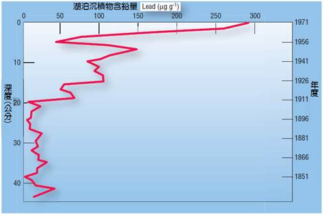 圖3-7 西雅圖附近華盛頓湖沉積物中的鉛(Pb)濃度。有一個在引線強烈增加濃度的的上層沉積。其他鉛已被釋放入湖作為一個在20世紀,反映了這個城市的污染物成長。
