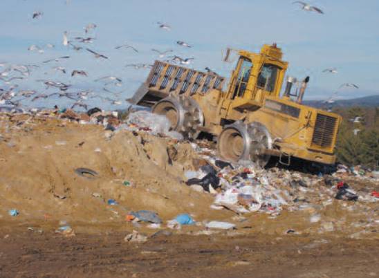 圖3-8 垃圾拖拉機和海鷗在一個晴天在轉儲。垃圾填埋作為垃圾處理的一種方式仍被廣泛使用,但最終將沒有更多的垃圾傾倒場。